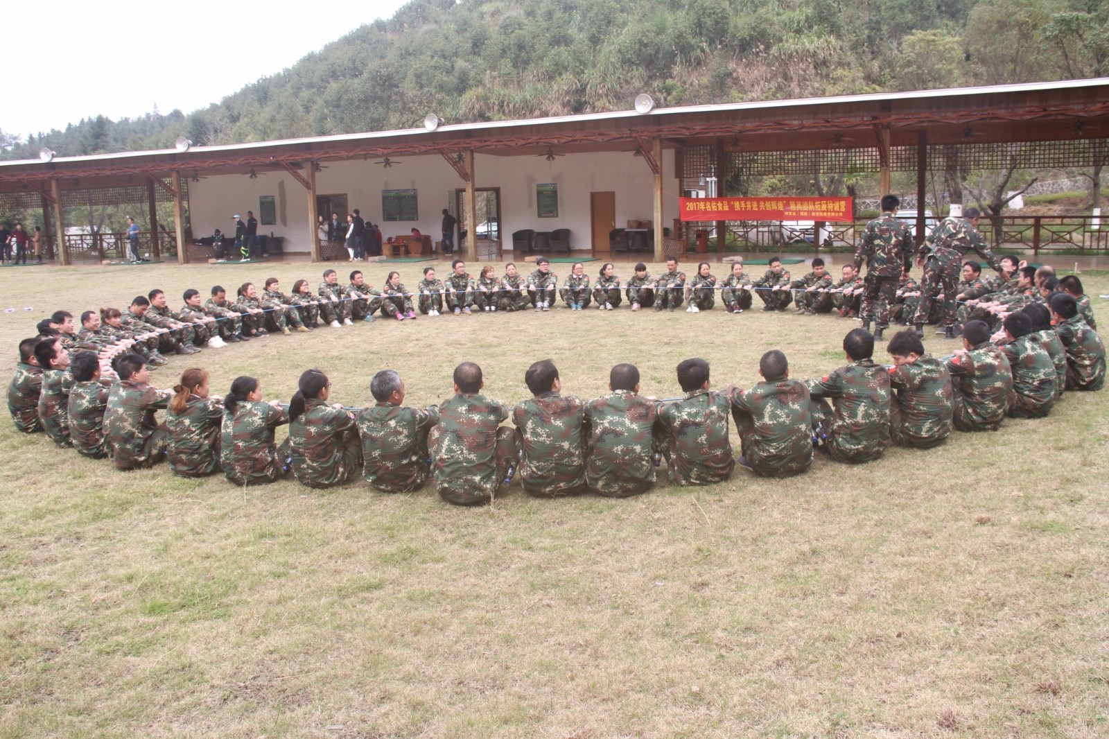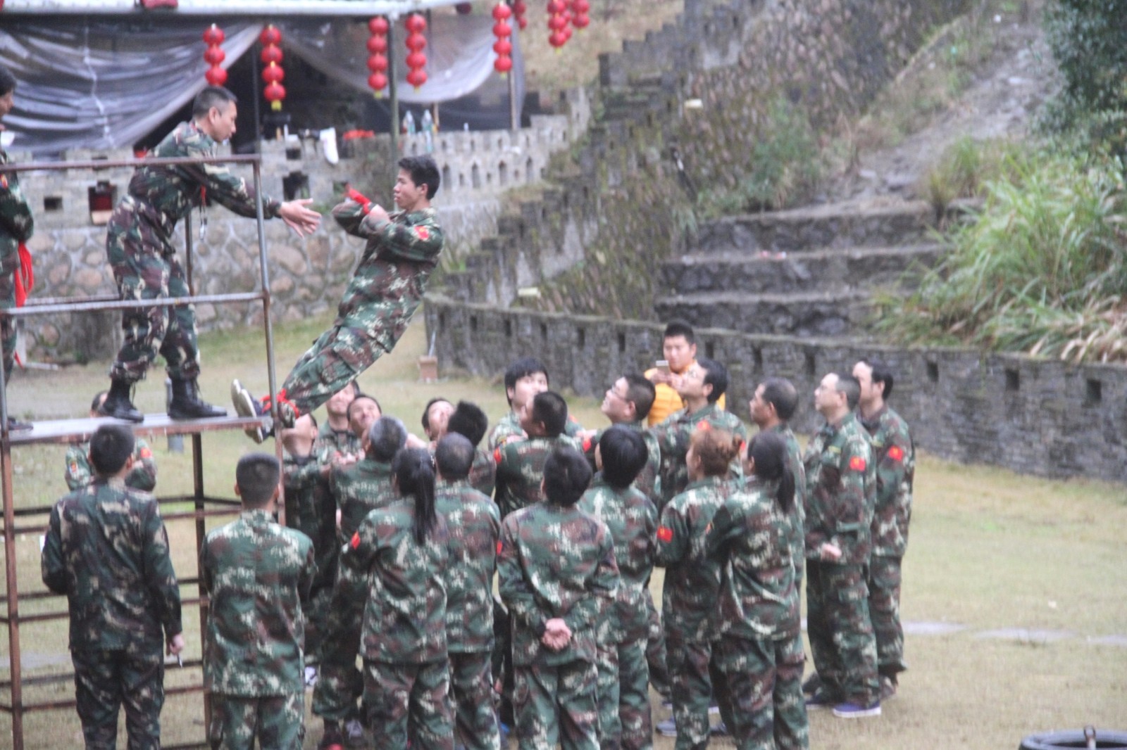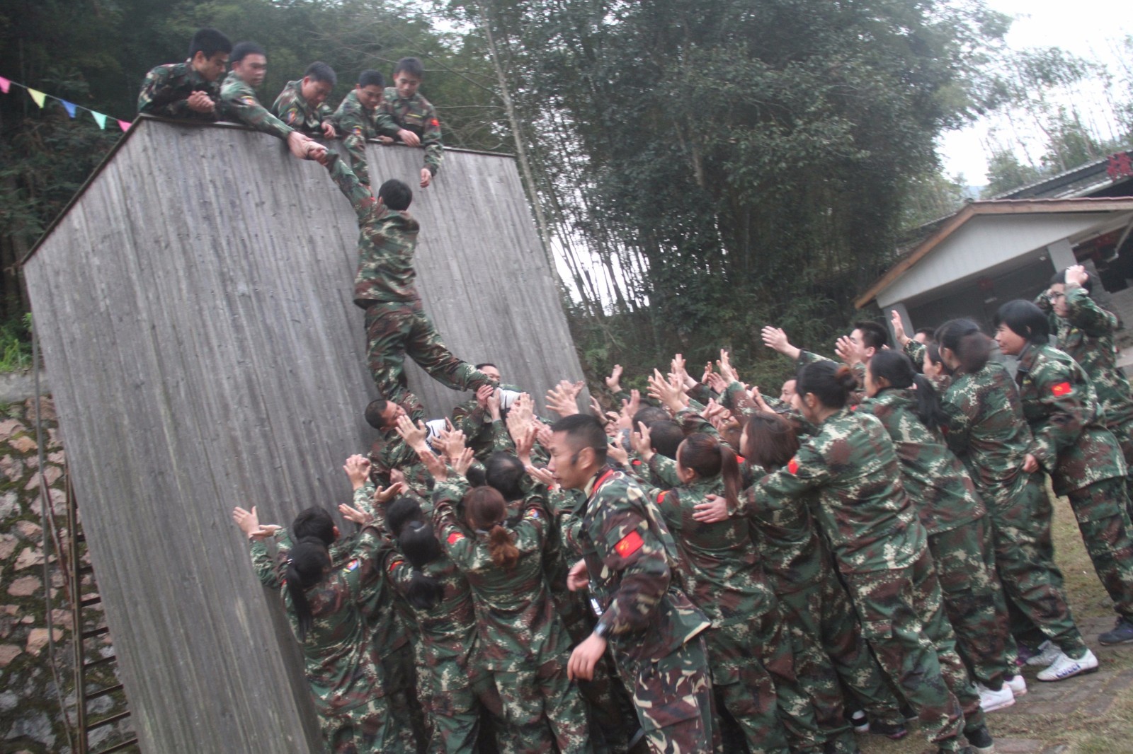第一天團(tuán)隊(duì)統(tǒng)一著裝迷彩服,進(jìn)行團(tuán)隊(duì)組建并建立統(tǒng)一的團(tuán)隊(duì)目標(biāo)。參加心情撲克牌、高空抓桿、盜夢(mèng)空間、七巧板等項(xiàng)目。