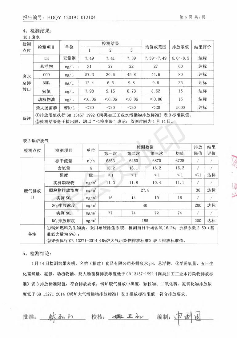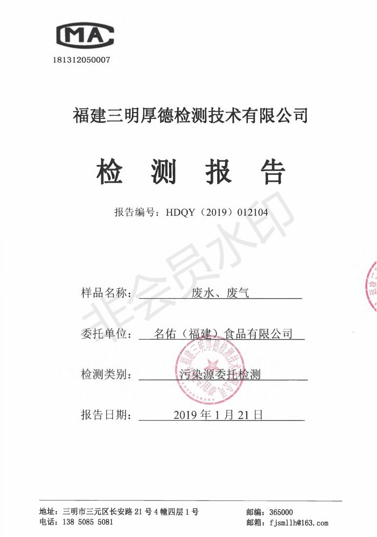 名佑(福建)食品有限公司2019年度1月環(huán)境自行監(jiān)測信息