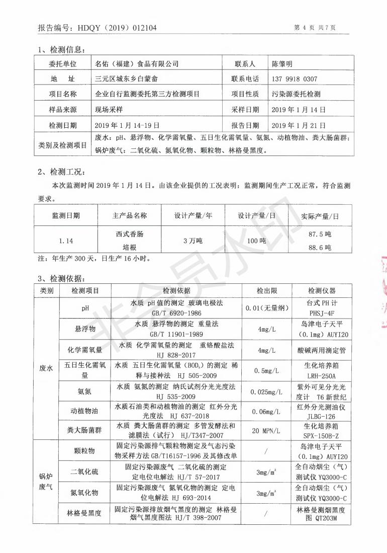 名佑(福建)食品有限公司2019年度環(huán)境自行監(jiān)測方案信息