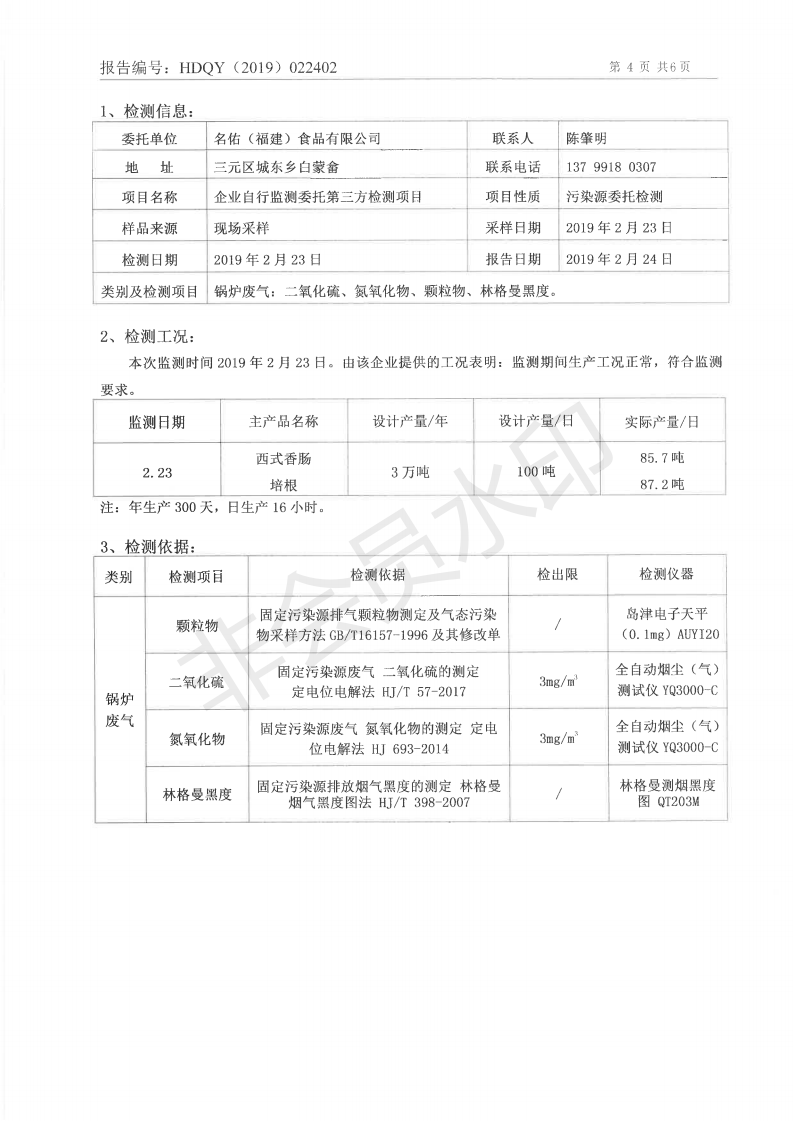 名佑(福建)食品有限公司2019年度2月環(huán)境自行監(jiān)測信息