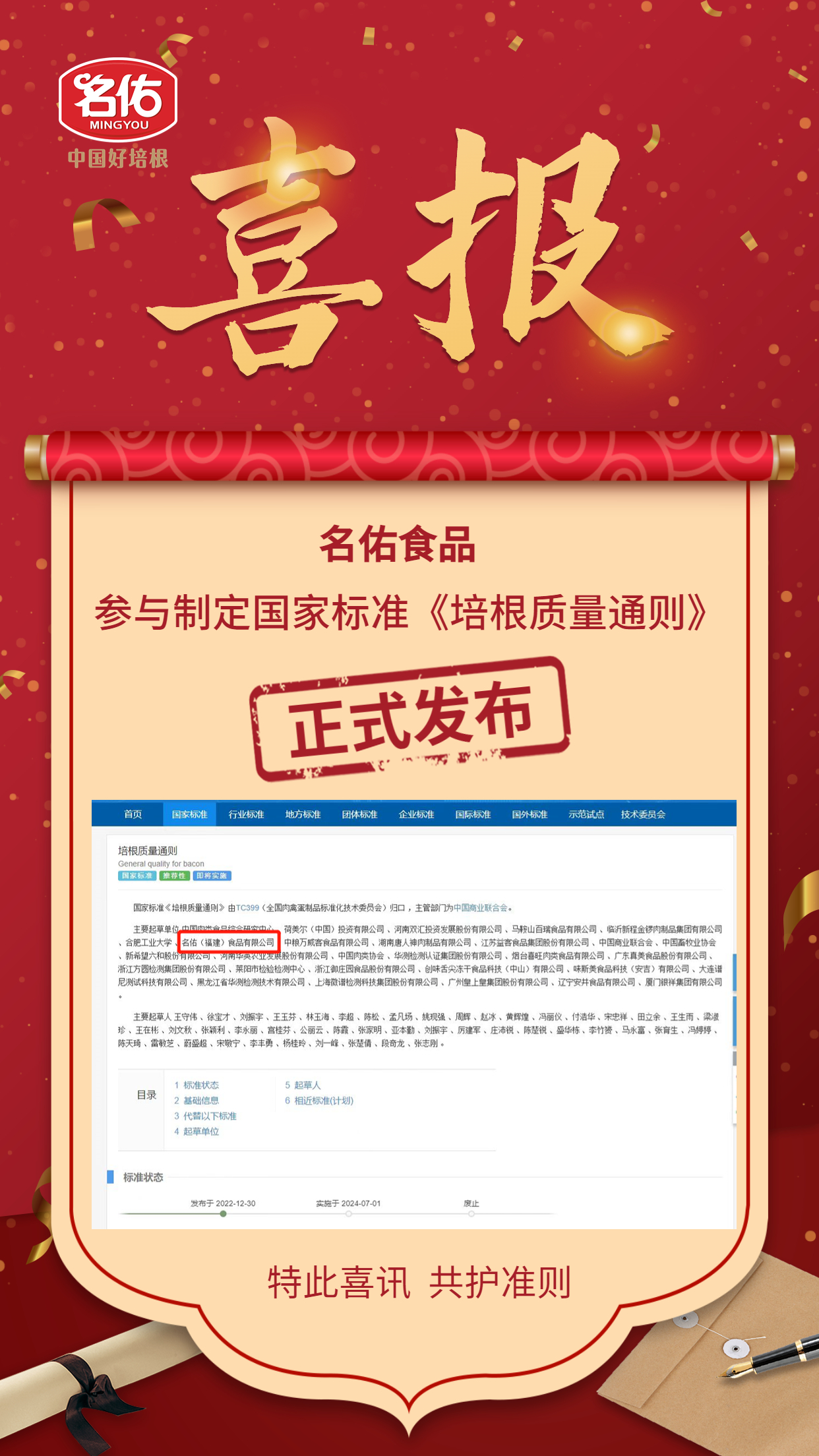 熱烈慶祝名佑食品參與制定國家標(biāo)準(zhǔn)《培根質(zhì)量通則》正式發(fā)布?。?!